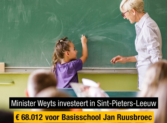 Vlaams minister van Onderwijs Ben Weyts (N-VA) investeert ruim 68.000 euro in Vrije Basisschool Jan Ruusbroec in Ruisbroek. “Onder meer met onze Scholen van Vlaanderen drijven we het investeringstempo sterk op”, zegt Weyts. “Tientallen leerlingen zullen in Sint-Pieters-Leeuw van nieuwe en hedendaagse onderwijsinfrastructuur kunnen genieten”, zegt Weyts.